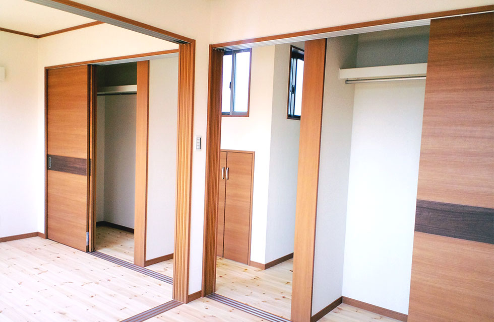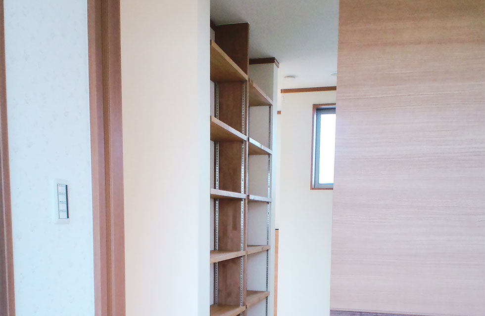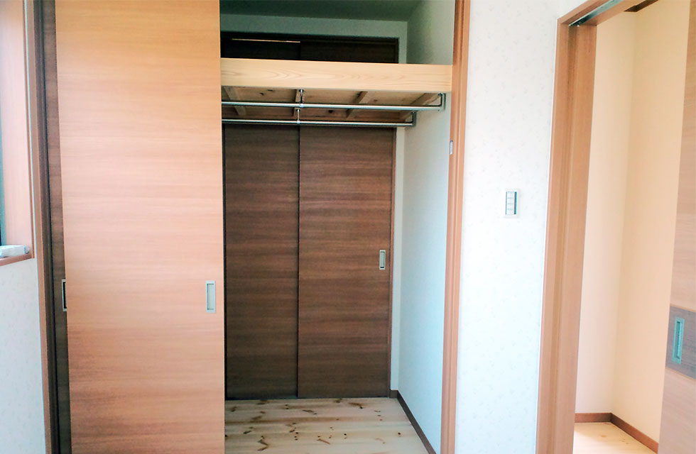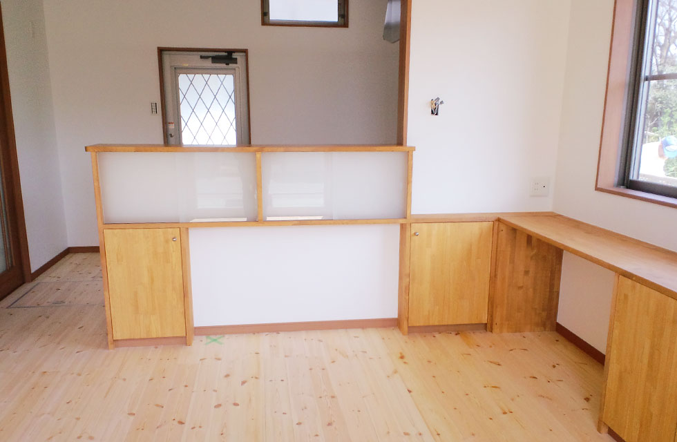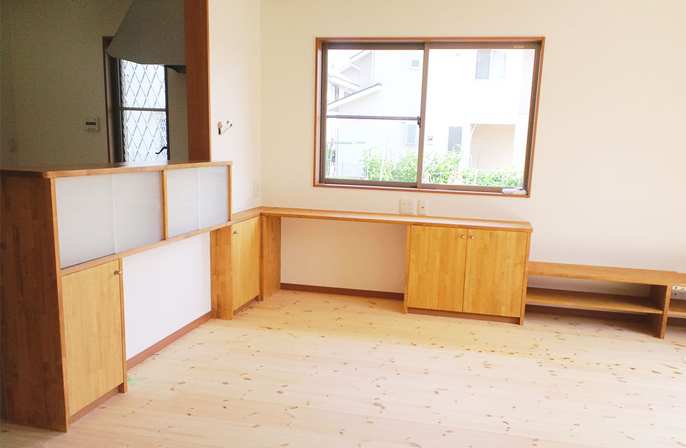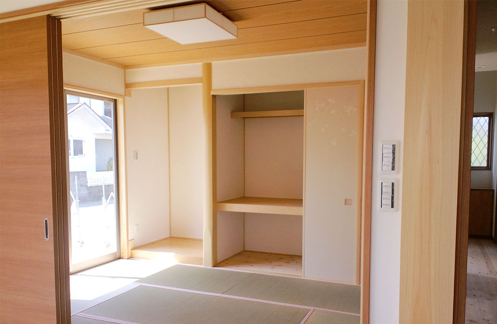 「心と体の健康を第一に」をとことん追求した住まい。 二間続きの子供室。入口とクローゼットの扉を3枚引の同一枠にて 扉を閉めた状態の子供室。間仕切り戸も3枚引き戸。 子供室クローゼットの奥行きの無駄を裏側から利用する本棚。 二つの寝室の間の両側から利用出来るクローゼット 寝室から見た廊下の本棚 吹抜けの代わりの勾配天井で開放感ある玄関とシューズクローク 玄関の天井 リビングと隣接するシンプルな造りの和室 LDKの作り付け家具。テレビコーナーとPCコーナー 対面キッチンカウンターの食卓の小物を収納する作り付け棚 階段下の一部を利用したトイレの手洗。 お客様支給のガラス製手洗カウンター。 キッチンの通気と採光の窓。 外観。将来太陽光を乗せられるように南面に大屋根になるように伏せてます。 家中開放的な引き戸多用の勾配天井のある家 住まいを新築しようと思い立ったきっかけを教えてください。 田隈校区で土地を探していたところ、ご縁がありみやたつ建設さんと出会いました。まずはホーミー教室を受講させていただいたおかげで、漠然と考えていた事が構築できるきっかけになったと思います。 エピソード 建設時のお話を聞かせてください。 全体的に風通しを良くするため窓の配置を相談したり、玄関入ってすぐ正面にはドアをつけないでほしいなど、細かな要望を聞いていただき、間取りや仕様決め、見積もり内容など、丁寧に説明をして下さいました。 現場の担当の方、職人さんの対応もや挨拶や片付け等も大変良かったです。何かわからないことがあると、担当の方が詳しく説明してくださって、納得できて良かったです。 お客様の声 玄関の一部を勾配天井にしてもらったので、明るさと開放感、広がりのある空間になりました。リビングには造作家具も作っていただきました。パソコン置きと、テレビのカウンターを固定で置いています。クローゼットの裏側には、みんなが使える本棚を設置してもらいました。みやたつ建設での家づくりは、地域の会社という事もあり、安心してお任せできたと思います。 私のこだわり 主人の出勤時の荷物が多く、自宅に帰ってきたときに、スッキリと簡単にまとめて置けるスペースが欲しかったので、シューズクロークを抜ける通路の一部に主人の荷物スペースを作れたのは良かったです。玄関の吹抜け希望という要望も、予算を余りかけず勾配天井という形で取り入れてもらいました。 みやたつ建設からのメッセージ お忙しい中何度も現場へ足を運んでいただき、仕様決めから棚の寸法など細かなところまで打合せを行いました。また上棟式では餅まきを行いまして、多くの地域の方に楽しんで参加して頂いてました。Y様ご家族と、近隣の皆さまの笑顔がとても印象に残っています。(現場担当:田中) 最後までお読みいただき、ありがとうございます。あなたも、まずは、住まいづくり教室(ホーミー教室)で「あなたの家族にとって最適な住まい」について学んでみませんか?スタッフ一同、心よりお待ちしております。