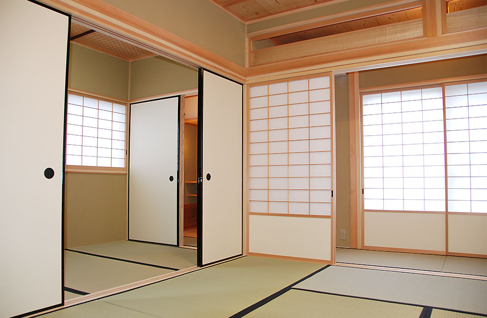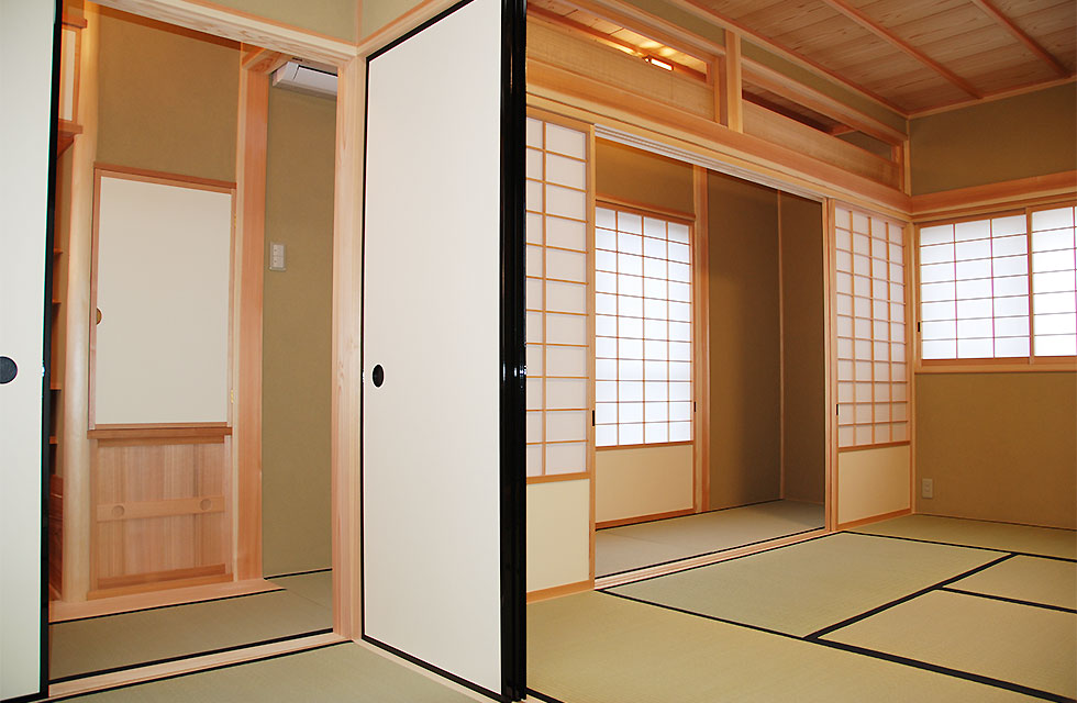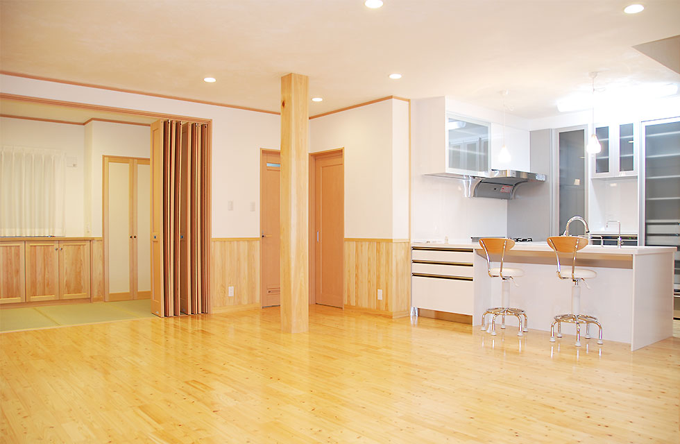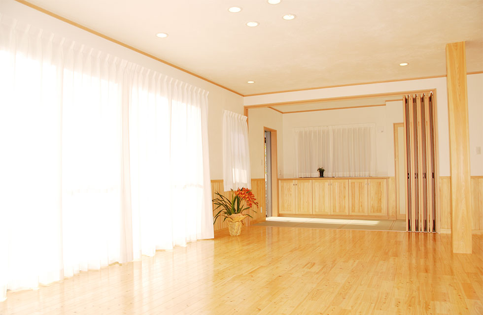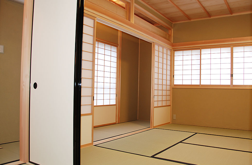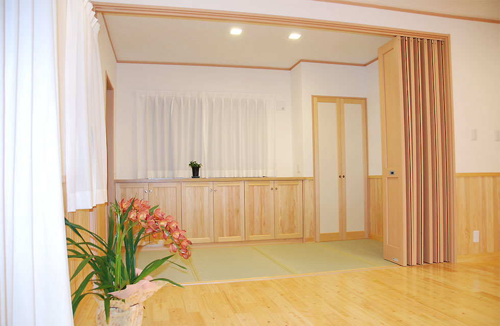 住まいづくり教室で、家づくりの考え方が変わった。 玄関ホールから奥の階段 5mx6mの大空間を支える8寸柱があるLDK リビングに隣接する畳コーナー リビング横のライブラリー室。お子様の勉強スペースにも。 ライブラリー室の本棚 洗面脱衣室。家族分の衣類棚。 中二階のお茶室の水屋 床の間の天井 リビング入口より畳コーナー 畳コーナーよりLDK 玄関横のシューズクローク 玄関からシューズクロークへ お茶室 前室から水屋とお茶室 広縁からお茶室、前室、広縁奥の水屋 炉がきってあるお茶室 お茶室から前室、広縁 水屋 外観。右側駐車場の上がスキップフロアの茶室 玄関へのアプローチ 駐車スペースの大空間を実現する為、集成材の大梁を使用 家族が集まる大空間リビングと、スキップフロアの茶室 住まいを新築しようと思い立ったきっかけを教えてください。 以前、みやたつ建設さんに実家を建てていただきました。 その時のみやたつ建設の方々の丁寧な対応や、親身になってお話を聞いてくださるお人柄がすごく印象に残っていたことと、希望通りの住まいが完成したことで、私たちも家を建てる際はまたみやたつ建設さんへお願いしたいと考えておりました。 エピソード 建設時のお話を聞かせてください。 まずは、間取りや仕様決めなどの打合せなど私達の意見を聞いて下さり、納得いくまで何度も打合せを繰り返していただいたので、とても安心して進めることが出来ました。 職人さんの対応や、現場の状態もいつもきちんとされていて、本当に気持ちよく対応していただきありがたく思ってます。不快な思いをすることは一度もありませんでした。 担当者の方の対応も、私たち以上に我が家のことを考えて下さり、ただただ感謝しかありません。 みやたつ建設に依頼をして、どうでしたか? 完成後の出来栄えもイメージ通りで、毎日帰宅するのが楽しみな家になりました。 後悔もなく大変満足しています。 みやたつを選んだ理由 みやたつ建設に依頼した決め手は何ですか? みやたつ建設での家づくりで決め手になったのは、細やかで私たちの事を本当に考えていただいていることです。何度も打ち合わせをしてもらえるので不安もなくなり、ちょっとしたことでも迅速に対応してもらいました。 お任せして良かったといつも思っております。 また、完成してからも何かとお世話になり、安心して暮らすことができています。 みやたつ建設からのメッセージ ご夫婦共お忙しい中での打合せは、終始奥様主導で打合せさせていただきました。隣接する奥様のご実家とのアプローチや、要所要所での収納、動線など、細かく打合せして作り上げていきました。お子様の勉強専用スペースも居間に隣接して作ることや、多目的に使える茶室などは、最初からこだわって要望されてました。桧の無垢材や珪藻土の塗り壁なども住環境がよくなるならと採用されました。個人的には茶室の材料を色んな所で探して廻ったのが大変でしたがいい思い出です。(プラン・現場担当:宇都)最後までお読みいただき、ありがとうございます。あなたも、まずは、住まいづくり教室(ホーミー教室)で「あなたの家族にとって最適な住まい」について学んでみませんか?スタッフ一同、心よりお待ちしております。